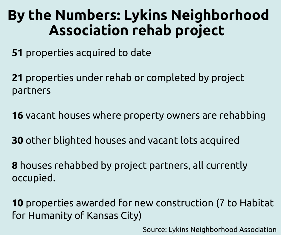 One of the Lykins Neighborhood Association’s partners is the nonprofit Trust Neighborhoods. It has been working with the association to support renovations of blighted buildings and prevent the displacement of residents. The nonprofit’s goal is to develop about 40 Lykins properties in the next 18 months and make 70% of those affordable in perpetuity, Lombardi said.