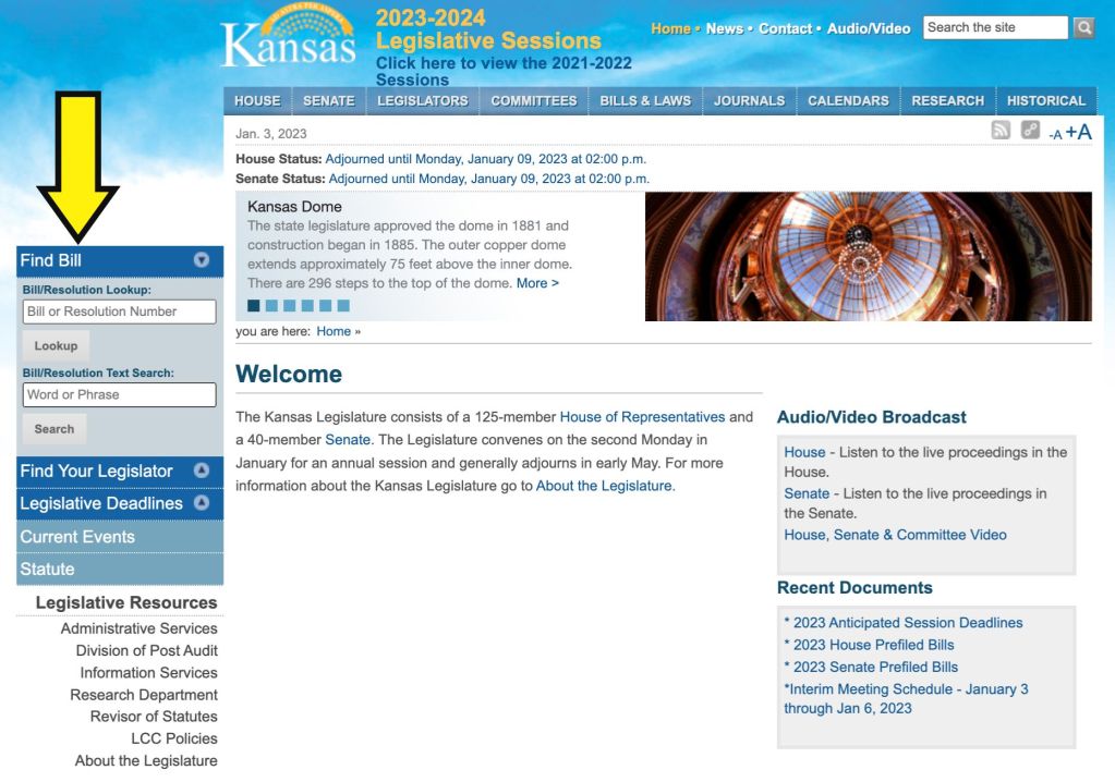 Each bill introduced in the 2023 Kansas Legislature will be assigned a number and listed in the order in which it was introduced under the Bills & Laws tab on the legislature’s website. Bills are easily searched by bill number using the Find Bill drop-down search tool on the left side of the website.