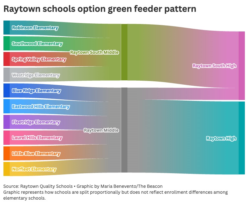 Currently, each elementary school feeds into only one middle school. But students from both Raytown Central Middle and Raytown Middle get split up when they go to high school.